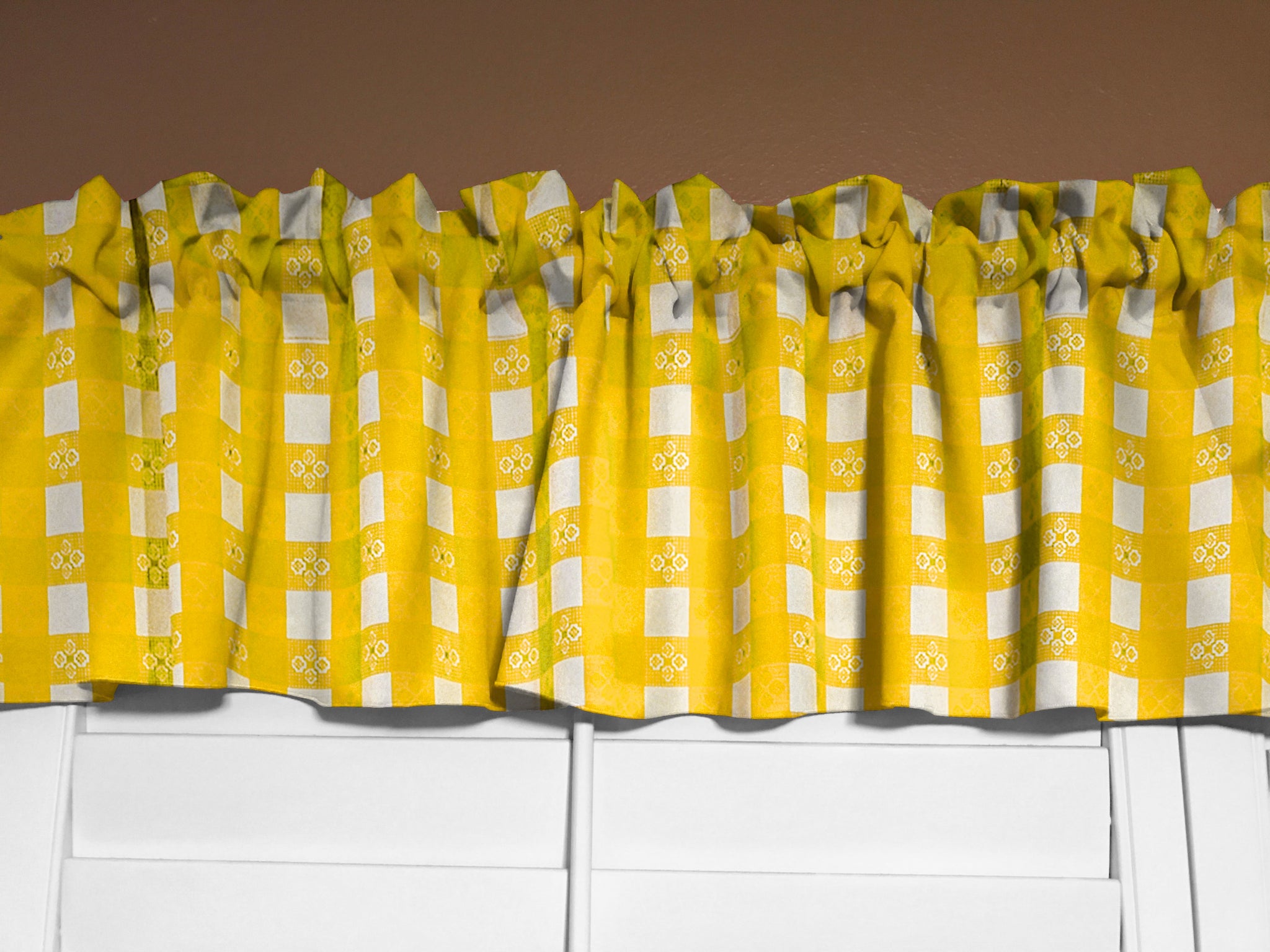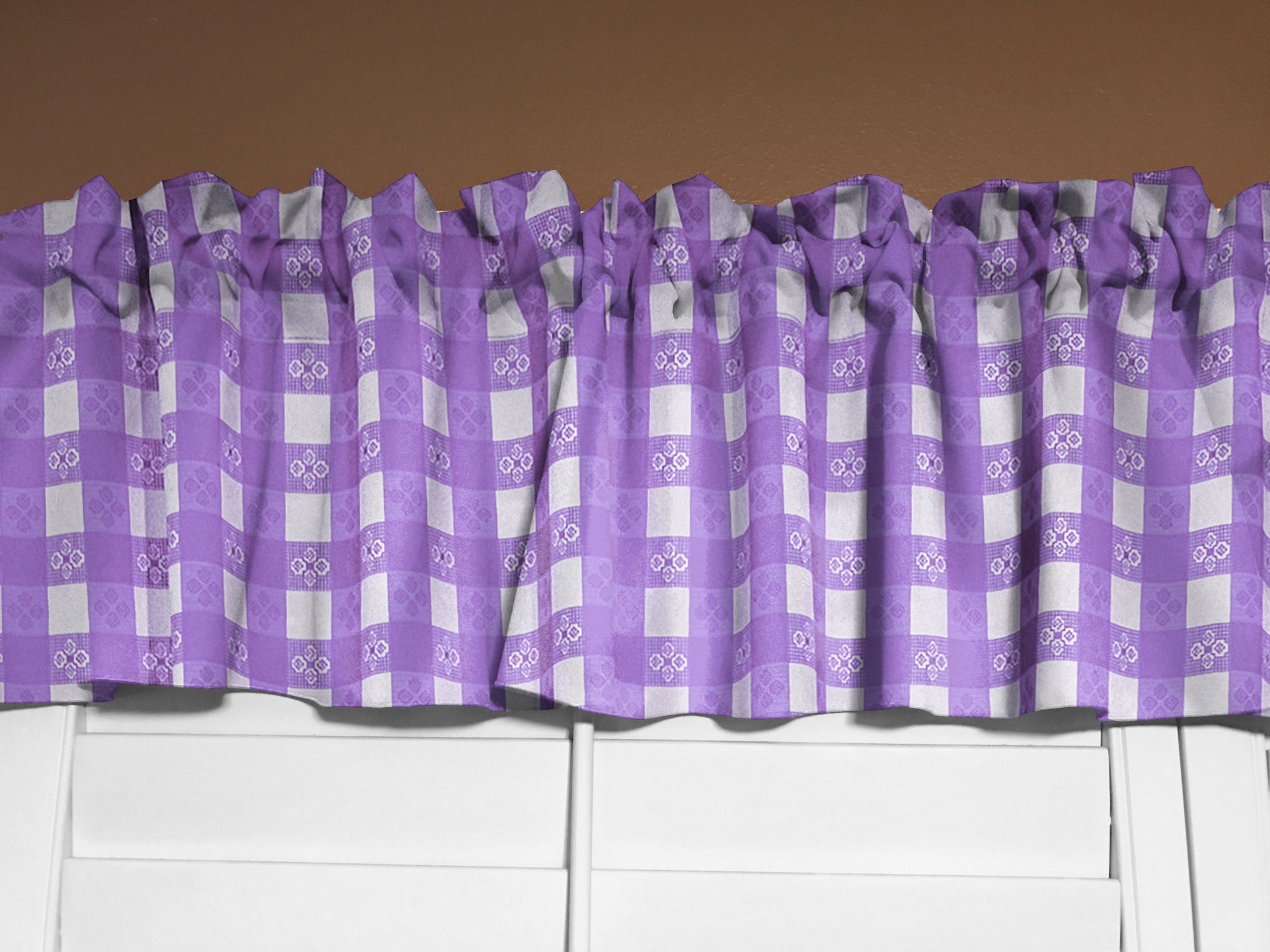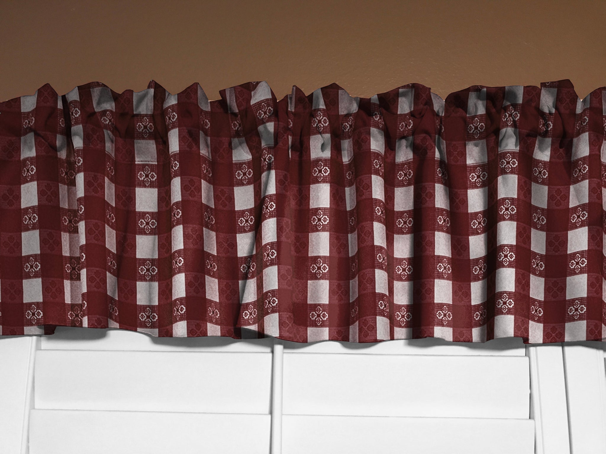 Polyester poplin fabric with a printed Tavern Check pattern made into a window valance. The valances have surged edges and no tags sewn in. Each valance has a 3 inch pocket for curtain rod insert and a 1 inch header. These valances are not lined or backed, they do not block complete sunlight. Machine washable. These decorative valances are perfect for themed events, special occasions, or everyday window decor. Includes 1 valance per quantity. *Due to different monitor settings, some colors may seem slightly different on your screen. Custom sizes available, please contact us to see if we can accommodate your custom size.