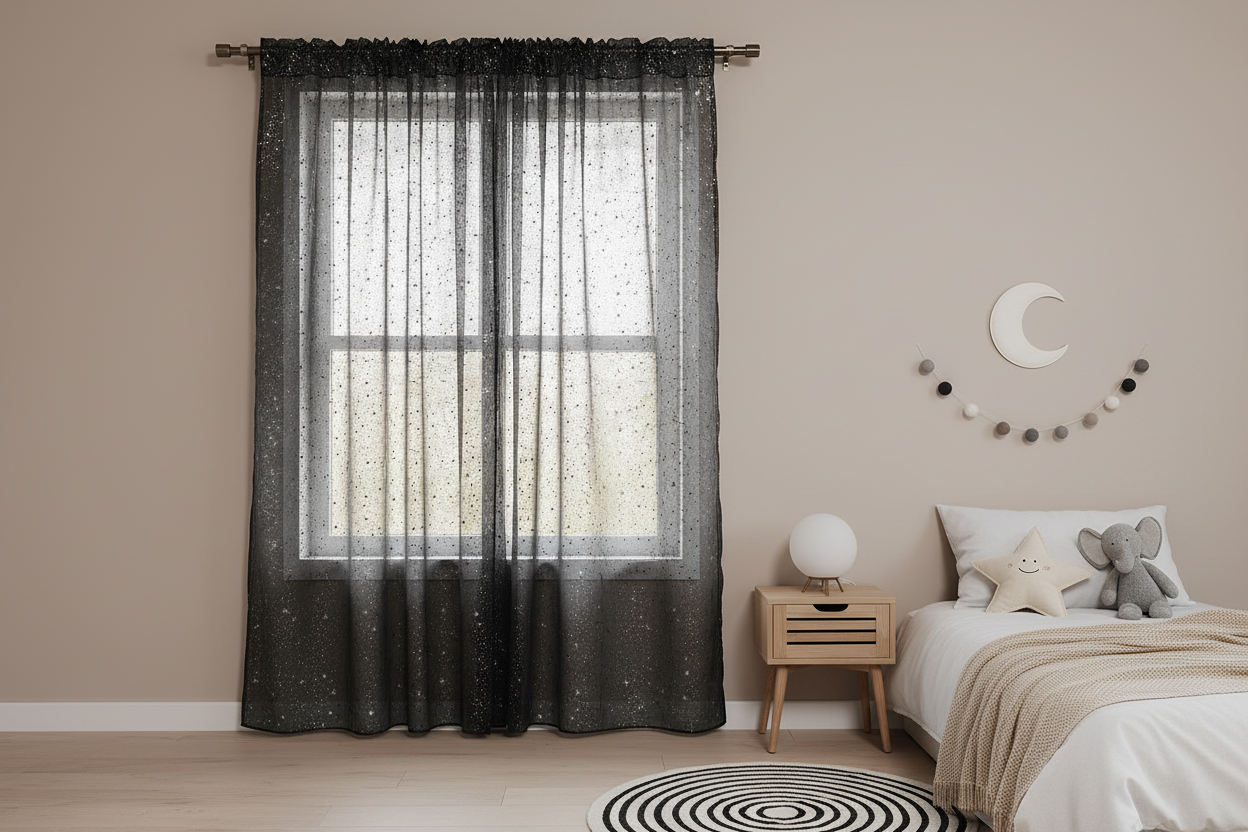 Add a touch of magic to any space with this sheer organza curtain featuring a delicate star pattern that softly shimmers as light passes through. Designed to create a dreamy, whimsical atmosphere, this lightweight panel gently filters sunlight while adding a subtle sparkle that’s perfect for kids’ rooms, nurseries, or playful yet modern interiors.